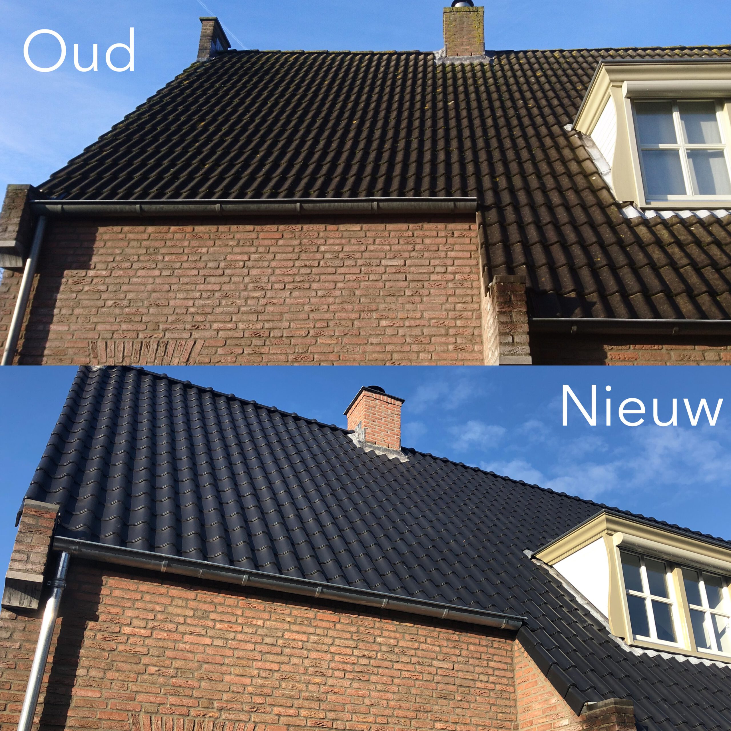 Dakrenovatie Vernieuwen van dakpannen, zinken goten en hemelwaterafvoeren. Het dak is voorzien van keramische pannen OVH zwart satinet. Terug naar overzicht