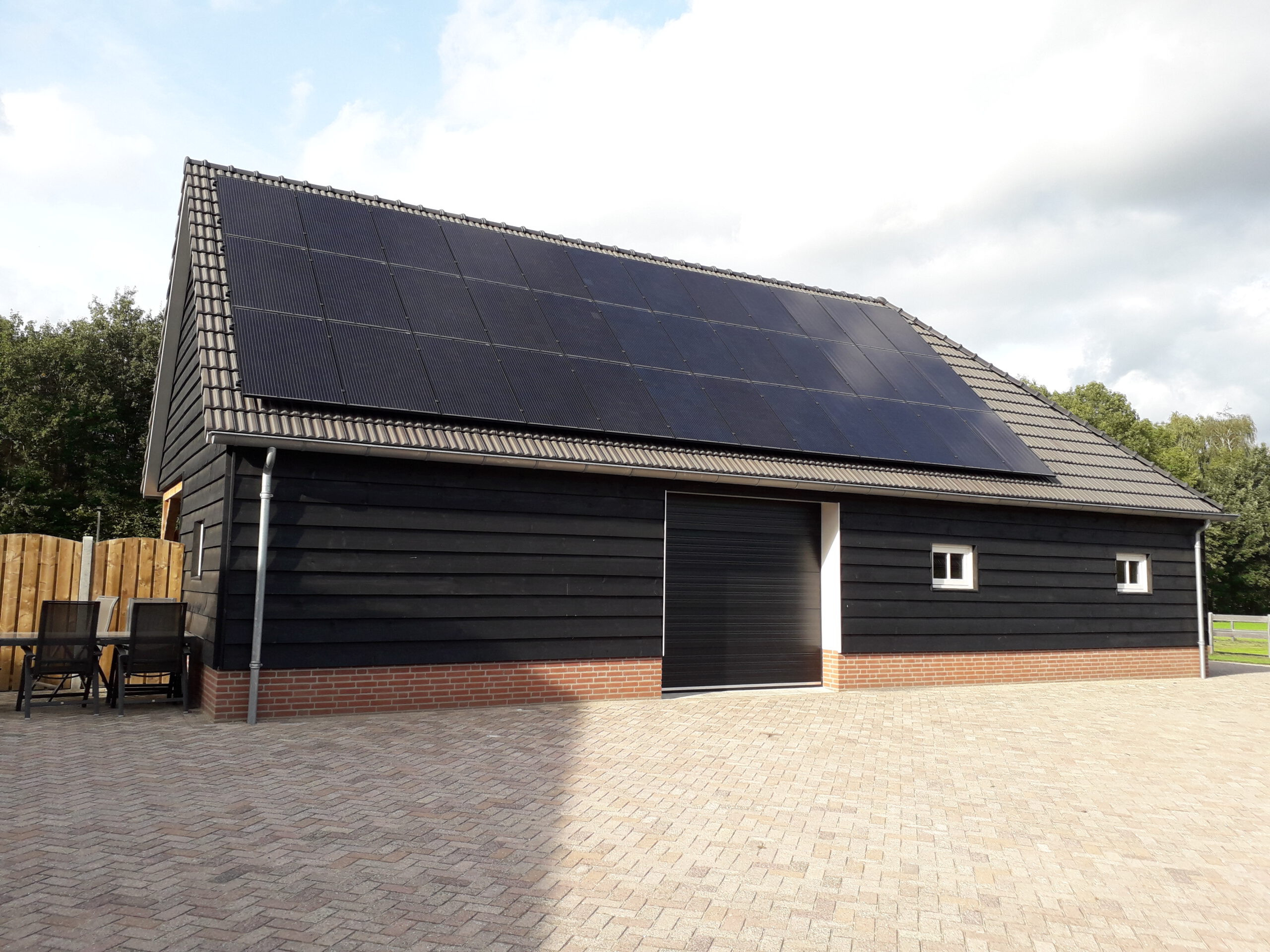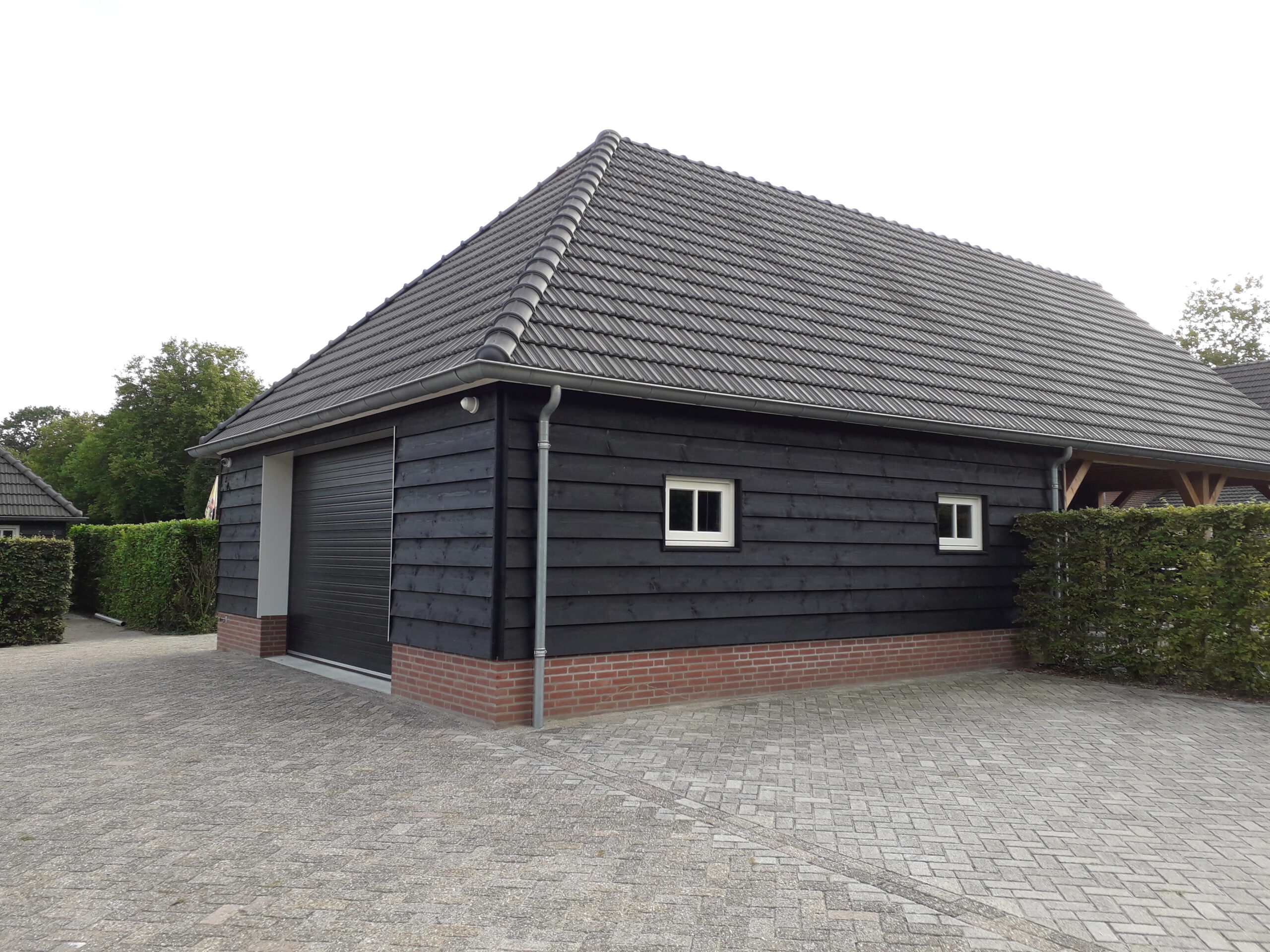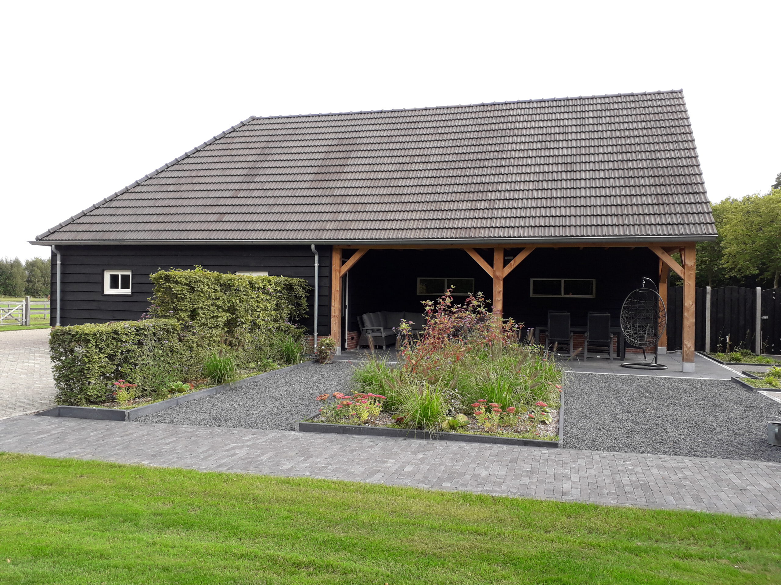 Hespelpad te Dongen Nieuwbouw berging/schuur met overkapping afgewerkt met zwarte potdekseldelen en douglas balken. Architect Dibotek te Dongen Terug naar overzicht