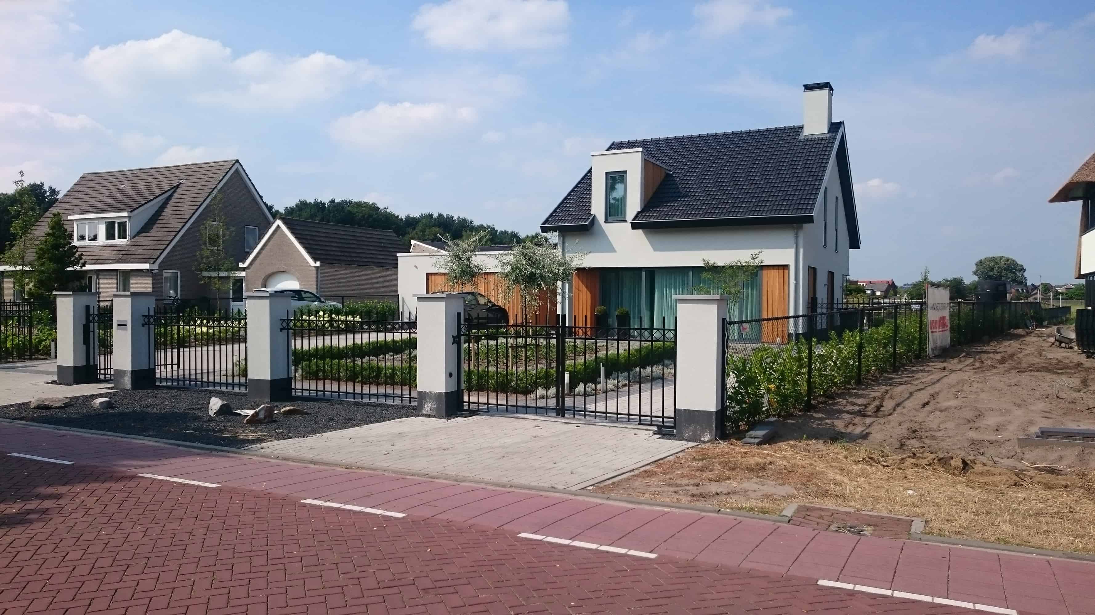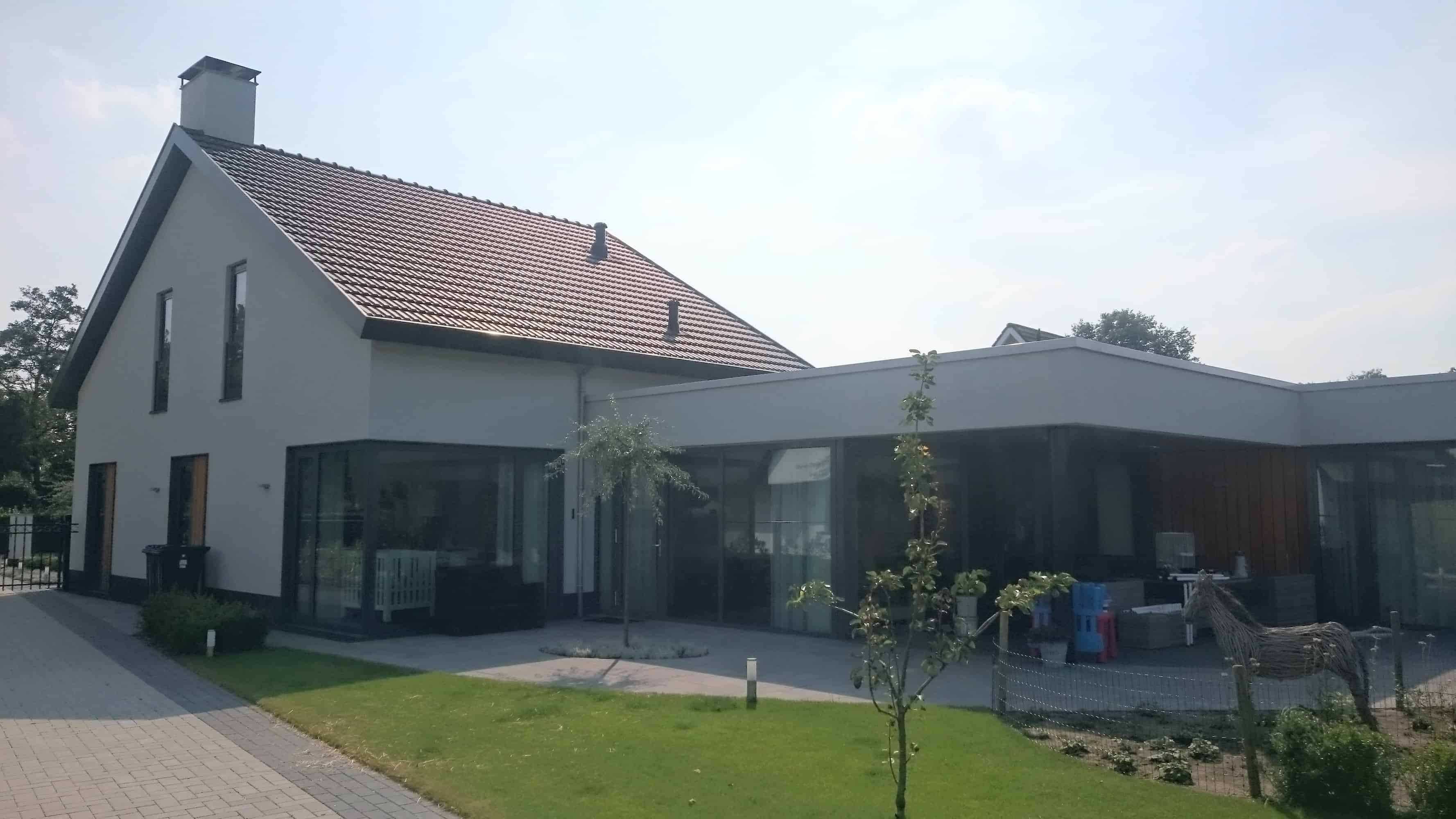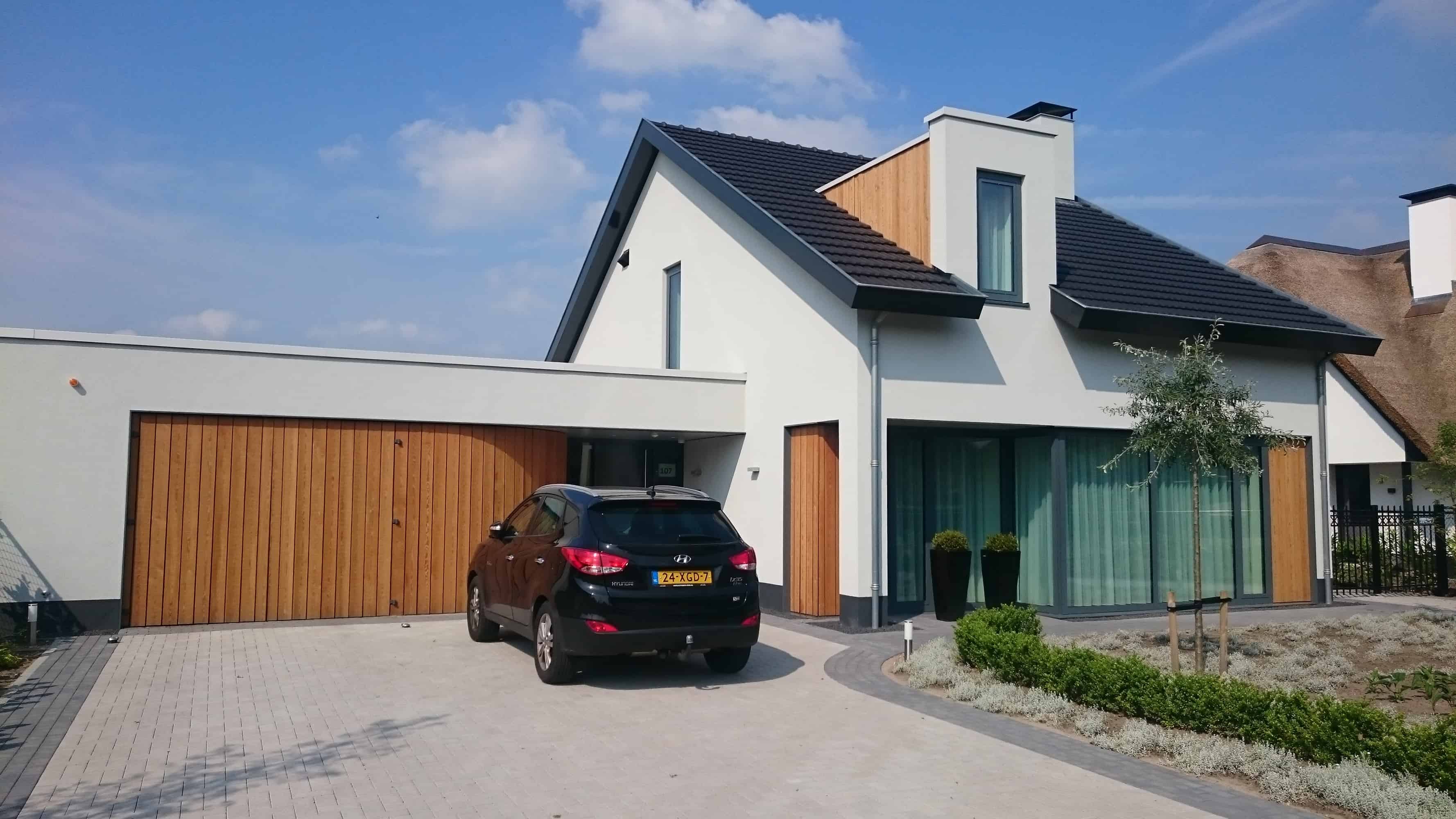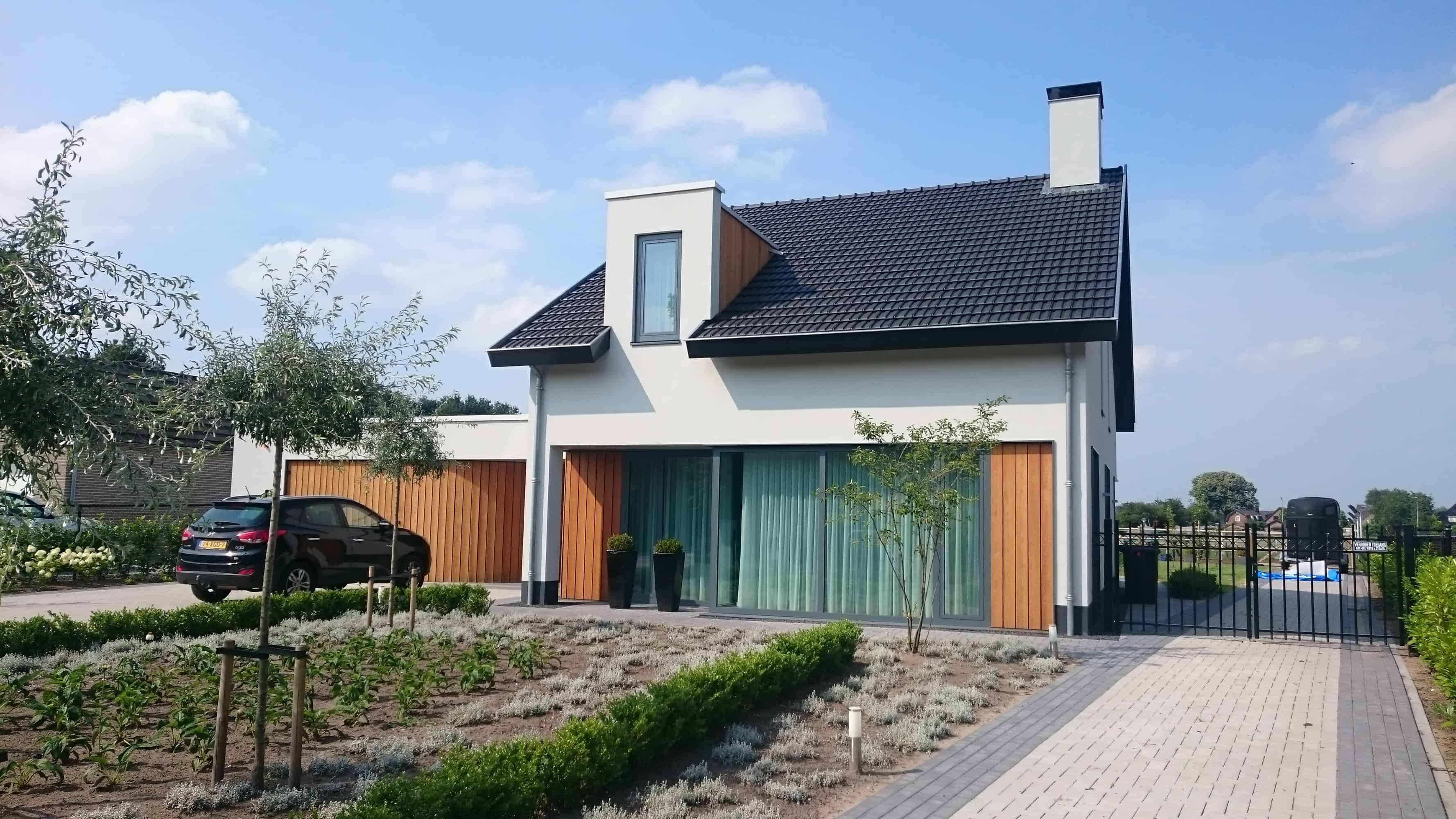 Nieuwbouw woonhuis met garage en grote uitbouw. De woning is voorzien van aluminium kozijnen en de buitenzijde is geheel afgewerkt met stucwerk en houten gevelbekleding.