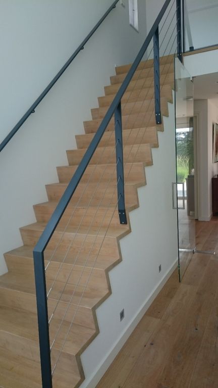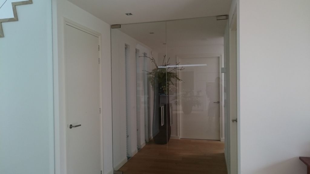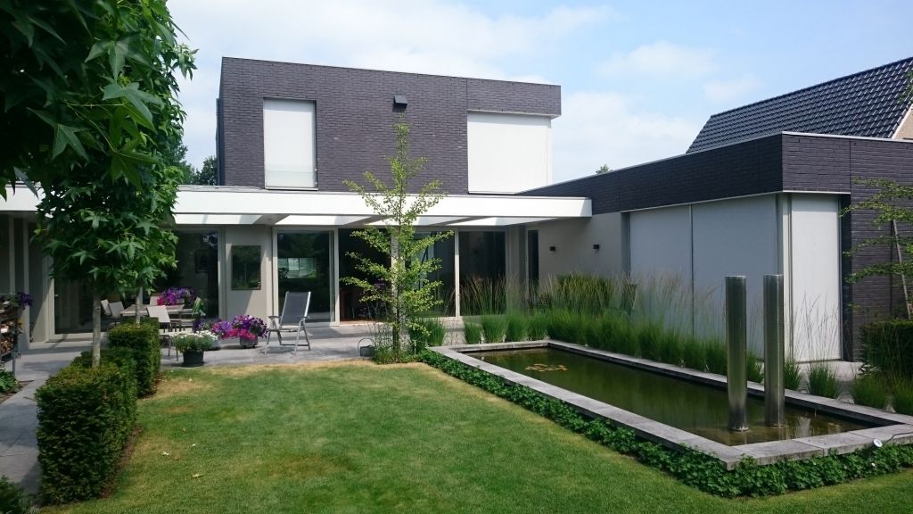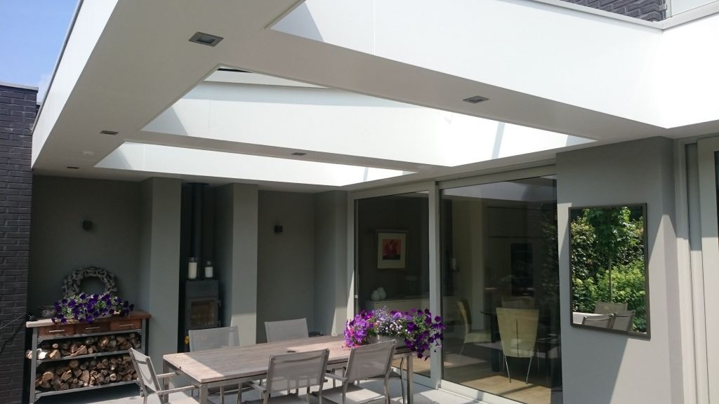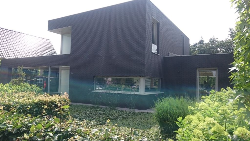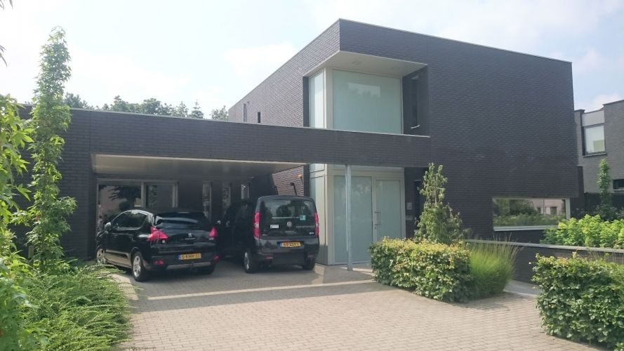Nieuwbouw moderne woning met diverse overkappingen. De woning is voorzien van aluminium kozijnen. Trap met houten treden zonder trapbomen in het zicht en stalen leuning met spandraden.